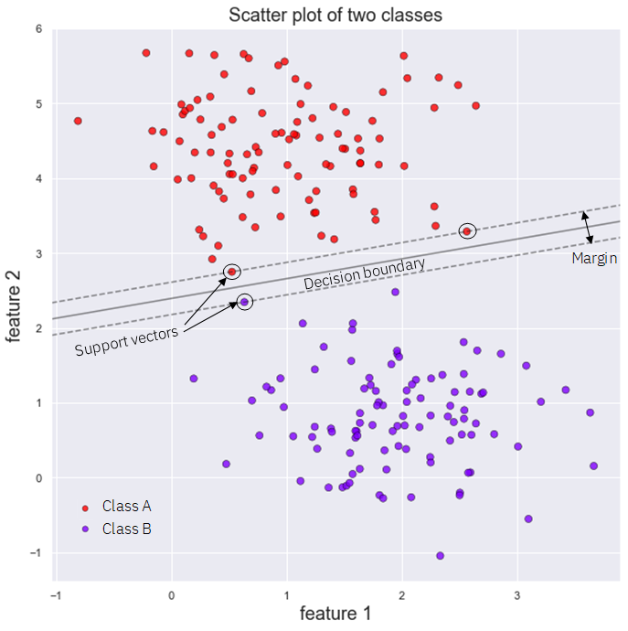 For classification, Support Vector Machines work by creating a decision boundary in between our data, that tries to separate it as best as possible, as shown in the following Figure: